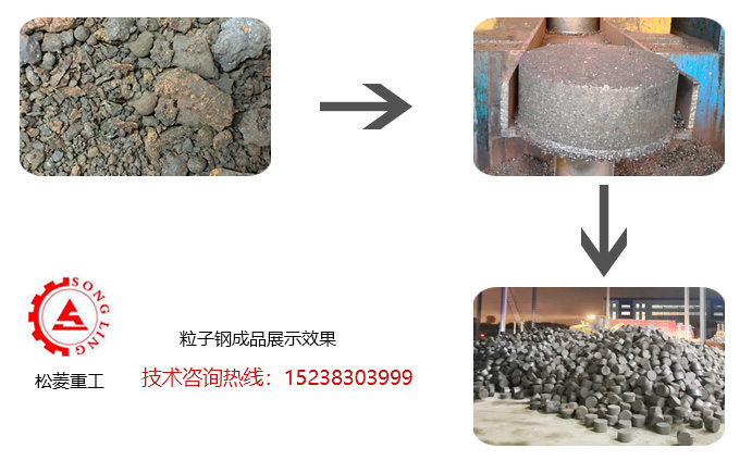 鋼渣粒子鋼是在鋼廠廢爐料里面分選出來(lái)的一種粒子鋼,它的顆粒比較細(xì)小,含鐵水量都在85%以上,但是鋼廠在回?zé)挼倪^(guò)程中不容易冶煉,因?yàn)榱W愉撌且环N比較松散顆粒比較細(xì)小的顆粒,在鋼廠冶煉過(guò)程中容易流失,浪費(fèi)了資源、提高了成本。鋼渣粒子鋼熱壓成型系統(tǒng)解決了上述弊端,將粒子鋼烘干至600℃--700℃,再熱壓成型,成型的塊狀物體比重為50--60公斤,方便鋼廠高爐降溫用,在投爐過(guò)程中也不容易被吹出,使成品料出水量提高,此項(xiàng)目屬于循環(huán)再利用項(xiàng)目。